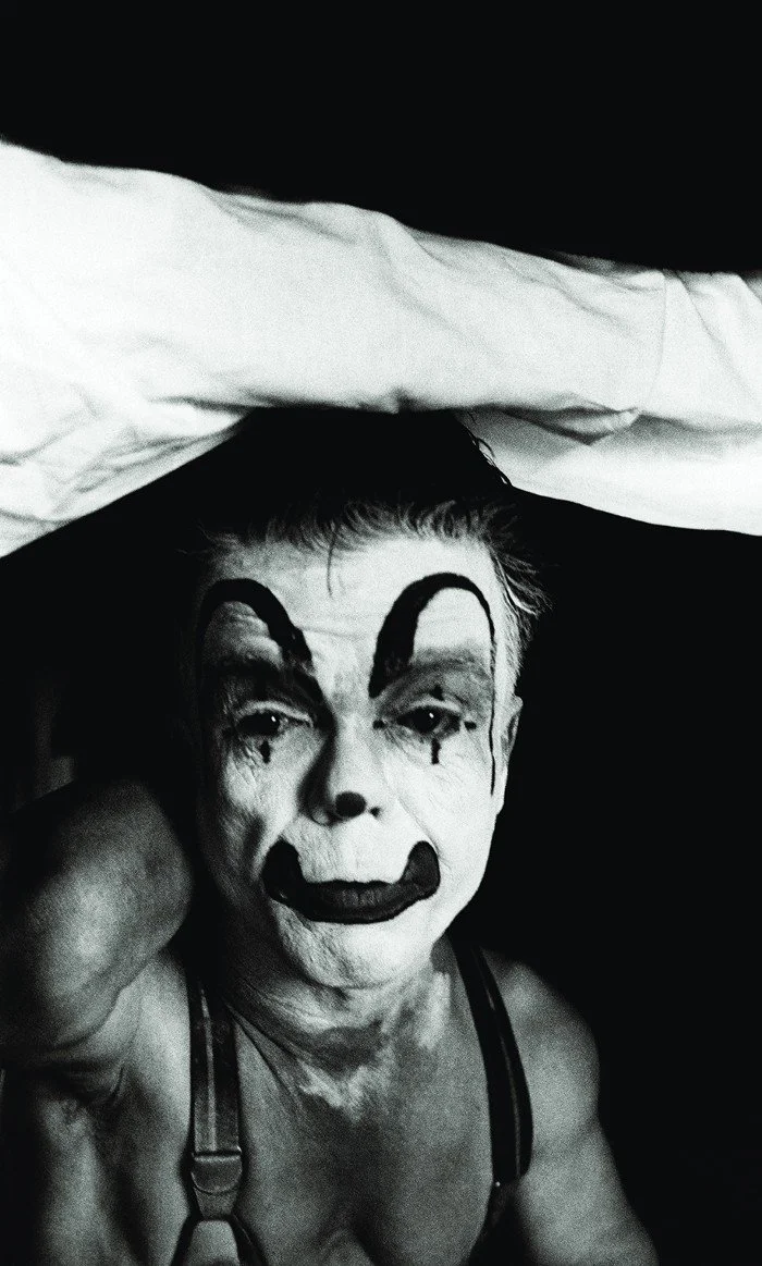 The second installment of Circus saw Davidson photograph the Ringling Brothers and Barnum and Bailey Circus when it played at an indoor arena in North Carolina in 1965. Here he took an altogether more distant stance as he cast a critical eye over the rising success of coliseum shows. With less emotional proximity, many of the photographs show performers swallowed by their steel environment. In the final installment in 1967 he documented an Irish one-ring circus. Here he had some of the roustabouts help him climb to the top of the tent structure so he could photograph the spectacle from high above. There are a number of recurring characters featured in Circus: the elephants and a young girl who rode them into the ring; Hugo Zacchini the βcanon manβ; and Emmett Kelly, one of the most famous American clowns of the 20th Century. But none had a more profound effect on Davidson than Jimmy Armstrong, a dwarf clown from the Clyde Beatty circus.
